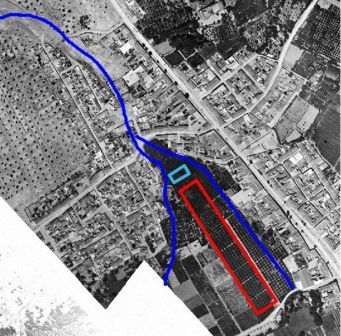En azul claro nuestra guardería, en rojo una hilera de edificaciones recientes del años 2006 y en azul oscuro cauce y zona de desagüe de la rambla.