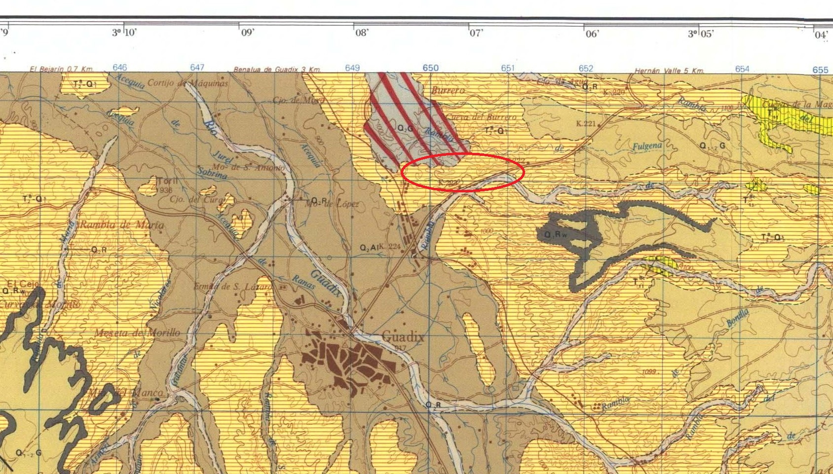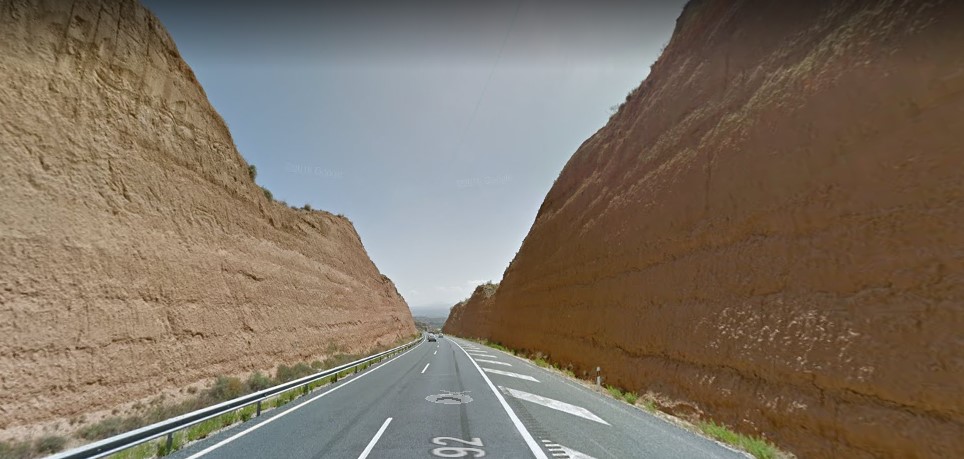 Uno de mis favoritos son los taludes de la A92 a la altura de Guadix. Se trata de una alternancia de conglomerados, areniscas y lutitas de color rojizo perteneciente a la formación Guadix. Es un material estratificado en capas y lentejones alternantes, en posición subhorizontal, que rellena toda la depresión de Guadix. Estos materiales forman el relieve “bad-lands” tan típico de la zona, y que forman parte del proyecto “Geoparque del Cuaternario Valles del Norte de Granada”.