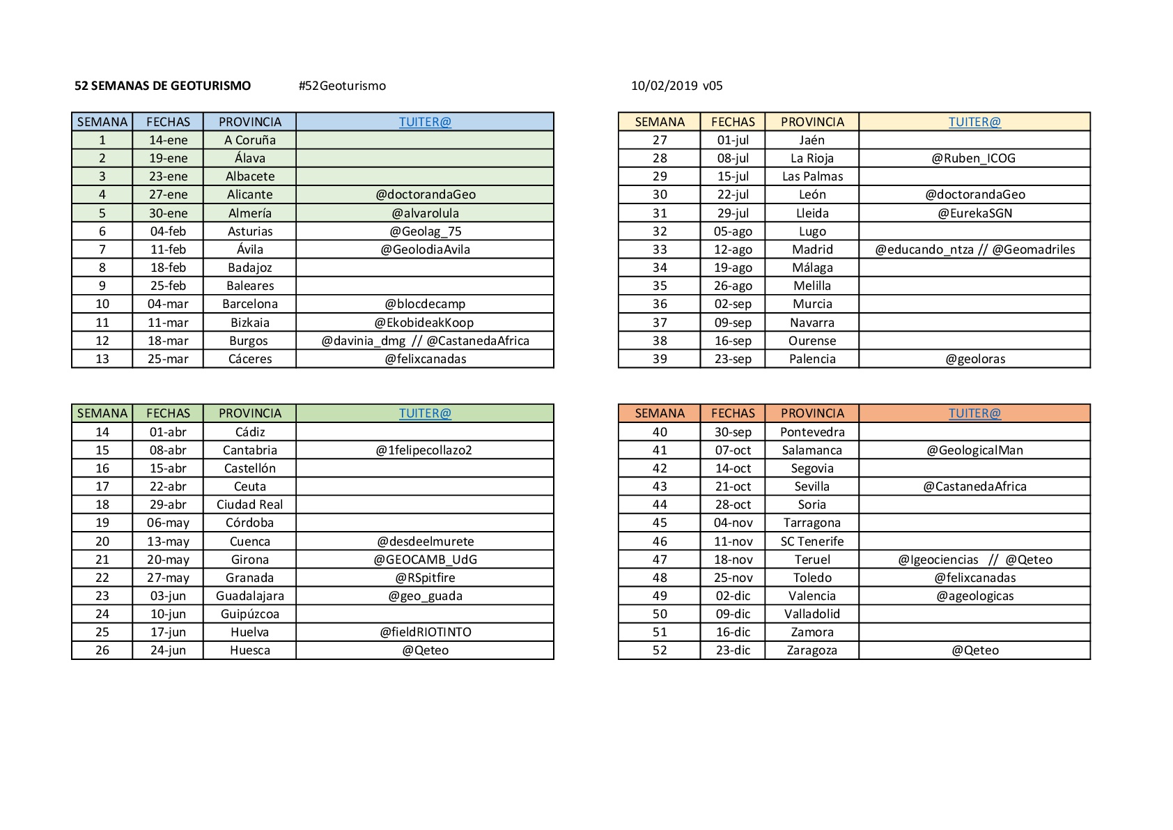 De momento estos son los colaboradores y las fechas previstas por provincias. Fundamentalmente se puede seguir por Twitter, aunque también  voy compartiendo en Facebook: