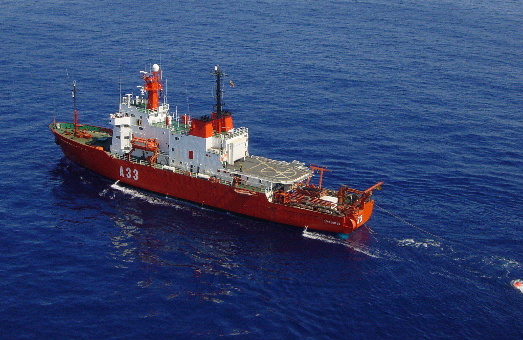 El «BIO Hespérides» a vista de helicóptero en el Mediterráneo Occidental. Los 82 m de eslora de la joya de la oceanografía española equipan una instrumentación de primer nivel para estudiar extensas áreas de los fondos oceánicos (Campaña MARINADA, agosto de 2002)