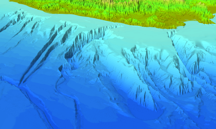 Imagen 3D de parte del relieve submarino de Catalunya. Los principales cañones se localizan a la derecha de la imagen (Cañón de Palamós) y en la zona central (Cañón de Blanes).