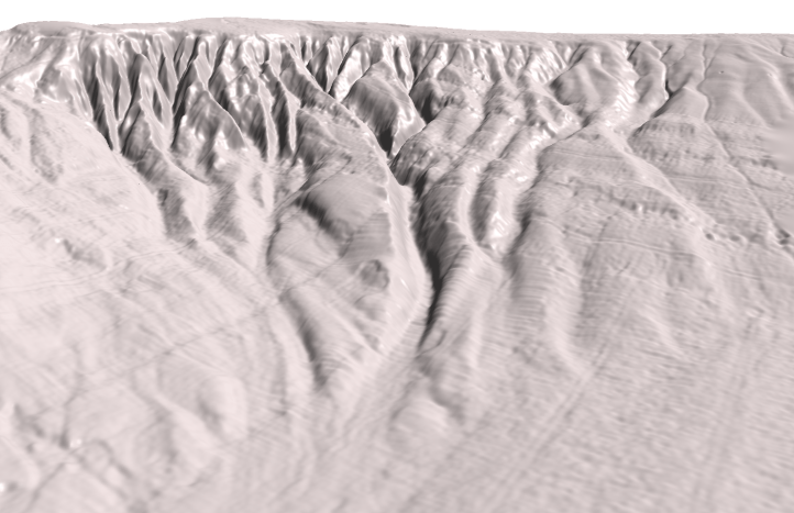 Imagen 3D del conjunto de cárcavas y canales menores de la parte superior del canal INBIS. Estos datos se han incorporado en la última versión de «The International Bathymetric Chart of the Arctic Ocean» (IBCAO).