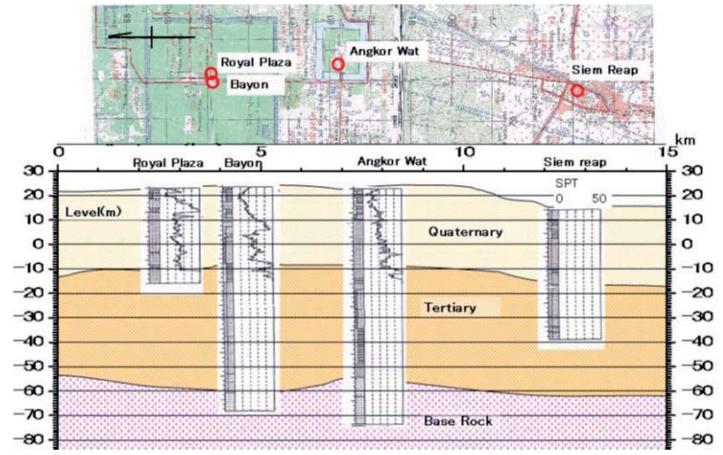 La mayoría de los monumentos están cimentados en estas terrazas aluviales. Los suelos erosionados del Monte Phnon Kulen, proporcionaban material granular, gravas y arenas a las zonas cercanas (llanura de Angkor) y materiales más finos, como arcillas y limosas a las zonas lejanas de la montaña y cercanas al lago Tonle Sap.