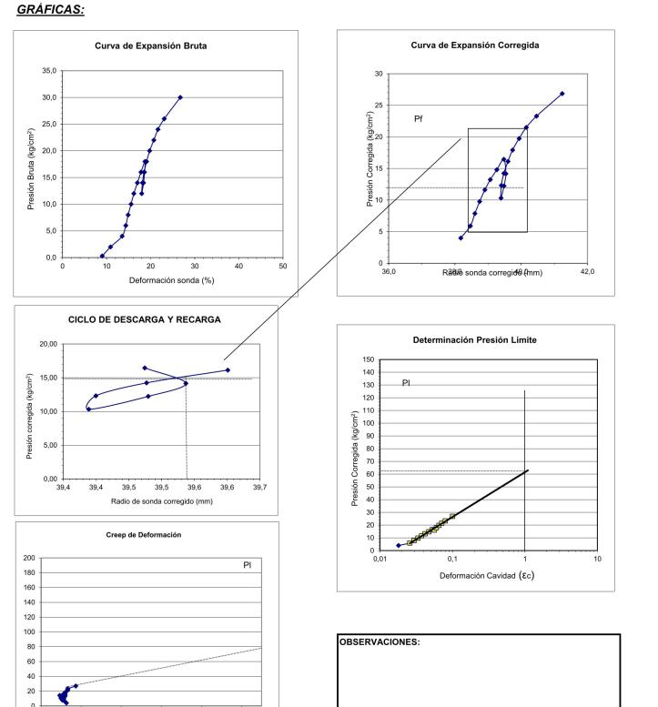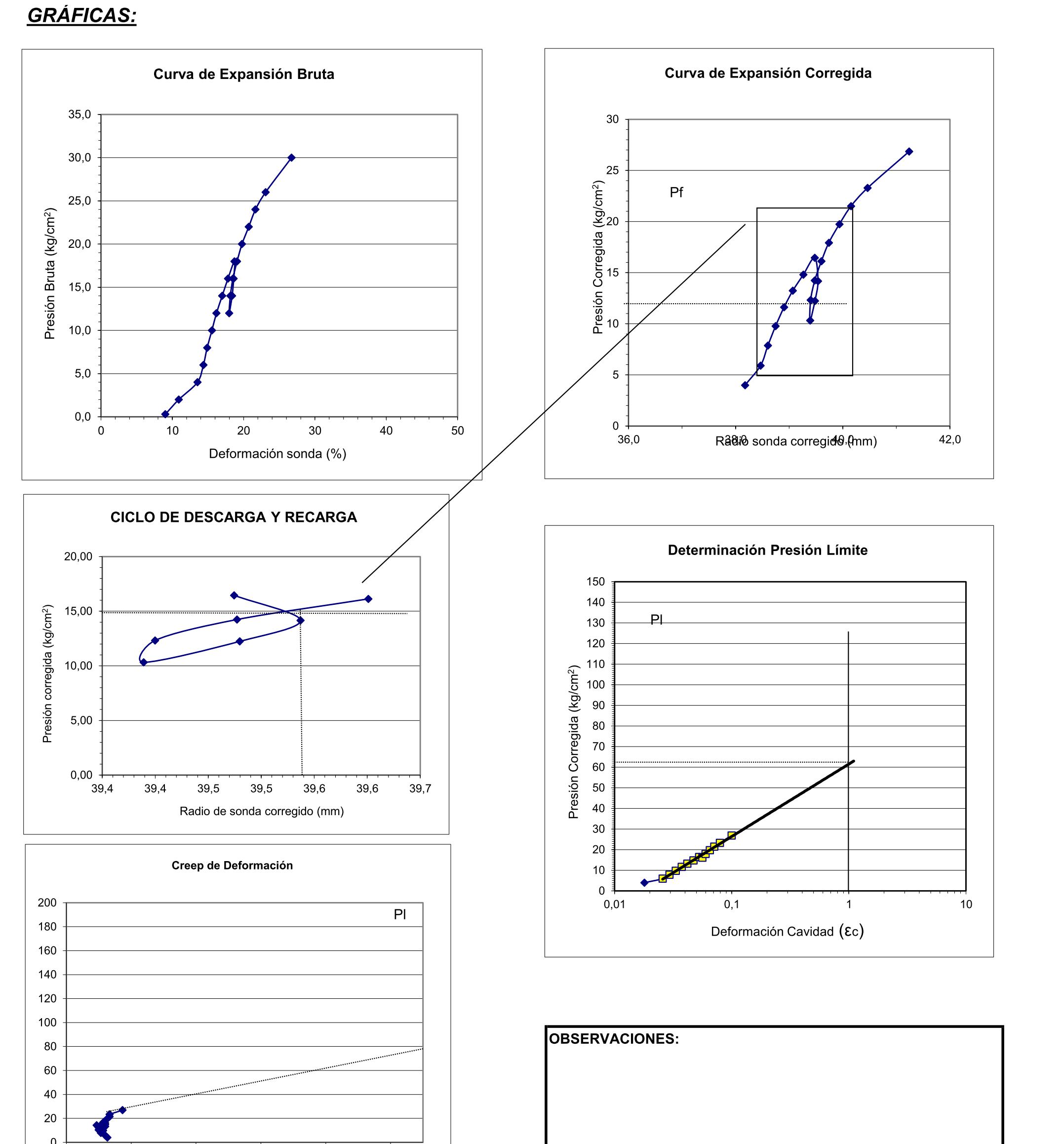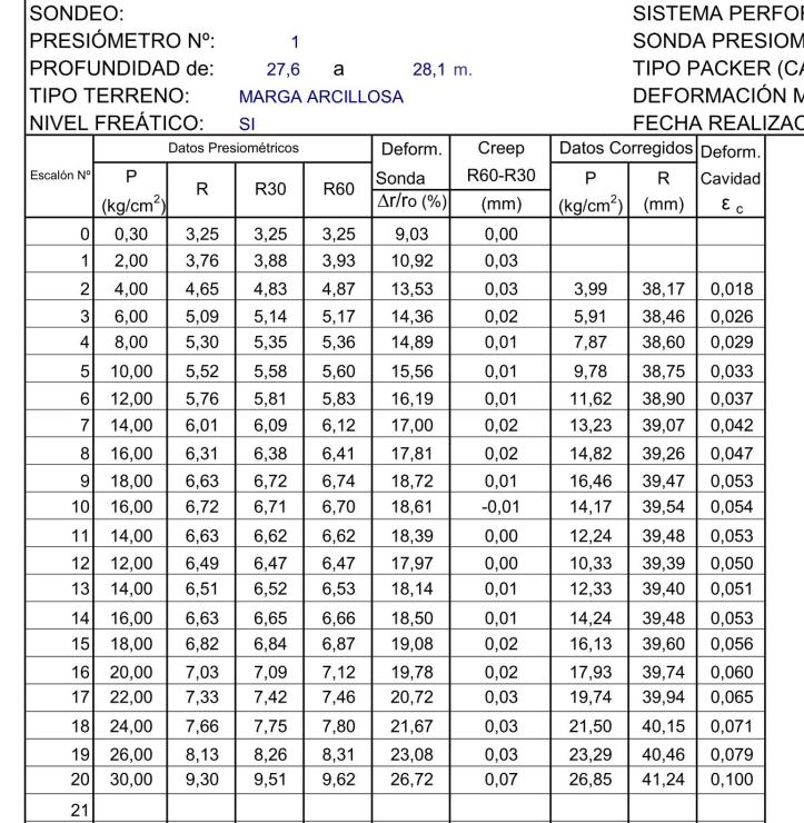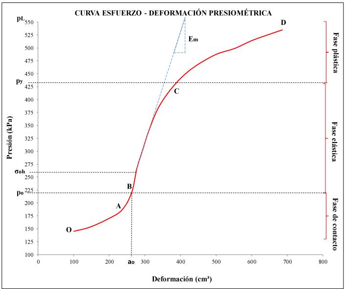 Tras aplicar las correcciones por cambio de volumen o por desplazamiento radial, los valores de presión (σ) y deformación radial (ε) se representan en ejes cartesianos. La curva presiométrica corregida es la base para determinar los parámetros de resistencia y deformación del terreno.