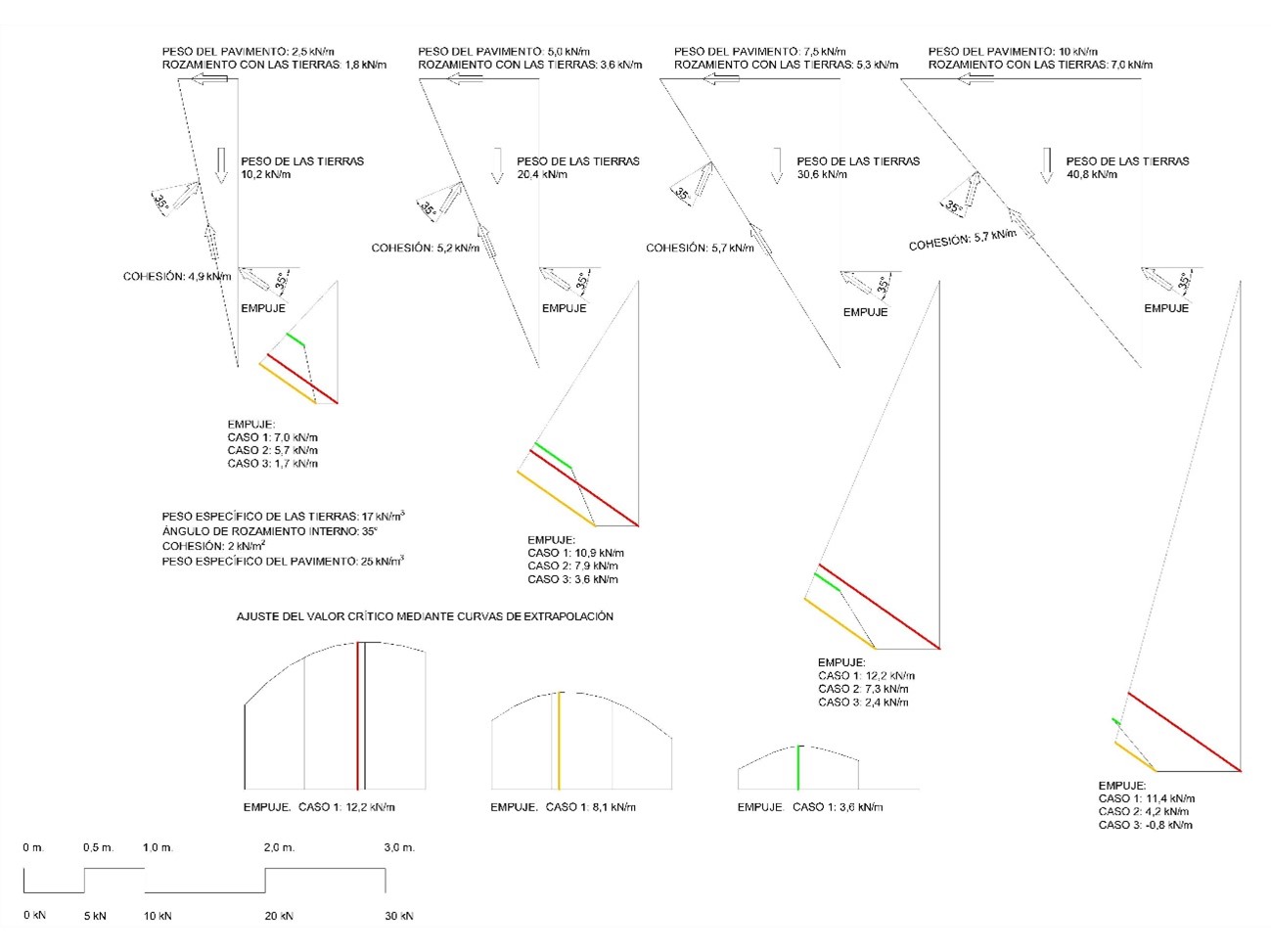 Por ejemplo, los métodos de cálculo de empujes basados en el equilibrio límite de cuñas se pueden presentar en las primeras asignaturas de estructuras. Son un excelente ejercicio para comprender el rozamiento y su efecto en el equilibrio. Además, permiten empezar a pensar en problemas en los que la clave no está en la tensión máxima en un punto sino en la existencia de conjuntos de ellos que al moverse permiten que se produzca una pauta de rotura.