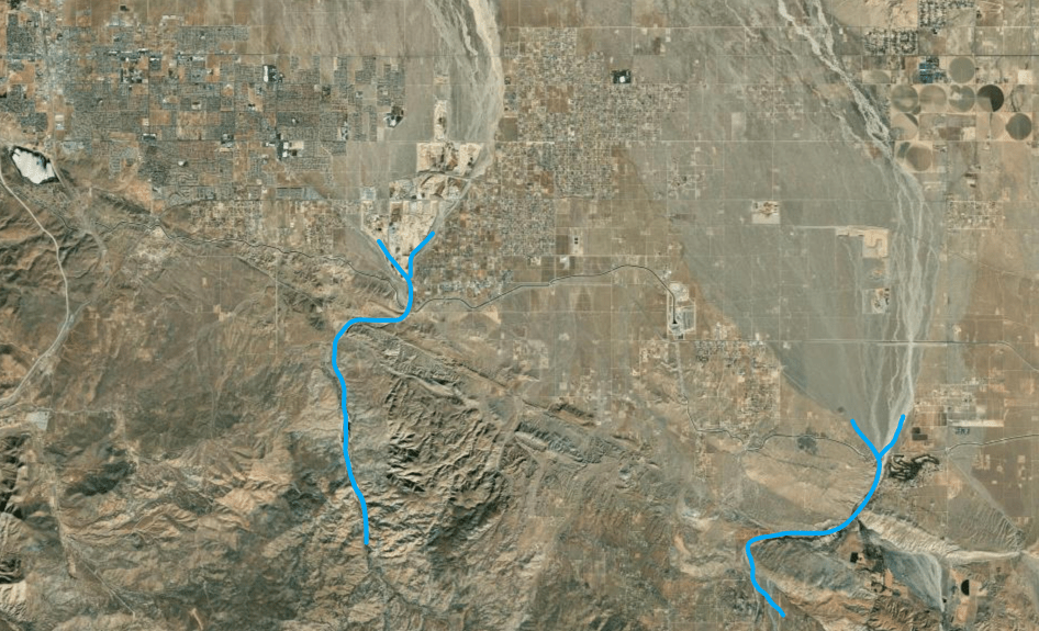 ¿Qué podemos ver en la imagen? Un lecho fluvial , parece seco. Abrimos más la imagen: Se pueden apreciar más cauces con esa misma flexión y se puede ver una lineación preferente en el terreno