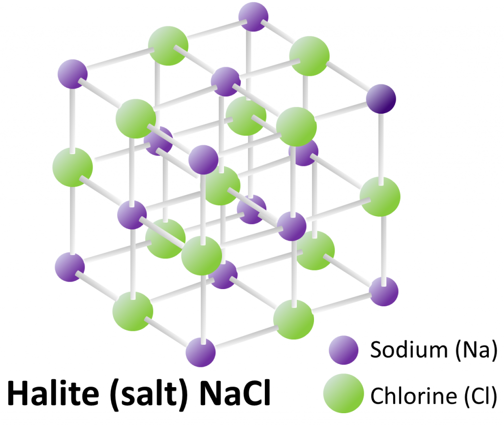 En este caso, los átomos de sodio (Na: púrpura) se alternan con los átomos de cloro (Cl: verde) en las tres dimensiones, y los ángulos entre los enlaces son todos de 90 °. Incluso en un cristal diminuto, como los del salero que tenemos en casa (sí, te comes un mineral ¿Lo sabías?), las estructuras reticulares se extienden en las tres direcciones durante miles de repeticiones. La halita siempre tiene esta composición y esta estructura.