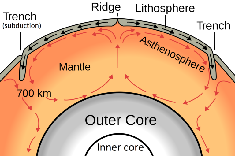El calor fluye continuamente hacia el exterior desde el interior de la Tierra, y la transferencia de calor desde el núcleo al manto causa convección en el manto (Figura 1.5.2). Esta convección es la principal fuerza impulsora del movimiento de las placas tectónicas. En los lugares donde las corrientes de convección en el manto se mueven hacia arriba, se forman nueva litosfera (en las dorsales oceánicas) y las placas se separan (divergen). Donde dos placas convergen (y el flujo convectivo es hacia abajo), una placa será subducida (empujada hacia abajo) hacia el manto. Muchos de los volcanes y terremotos más importantes de la Tierra están asociados con márgenes convergentes.