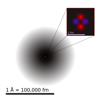 En la figura 2.1.1 se representa un átomo de helio. El punto del centro es el núcleo, y la nube que lo rodea representa dónde podrían estar los dos electrones en cualquier momento. Cuanto más oscura es la sombra, más probable es que un electrón esté allí. El átomo de helio mide aproximadamente 1 angstrom. Un angstrom (Å) equivale a 10-10 metros (m). El núcleo de helio mide aproximadamente 1 femtómetro. Un femtómetro (fm) equivale a 10-15 m. En otras palabras, la nube de electrones de un átomo de helio es unas 100.000 veces mayor que su núcleo.