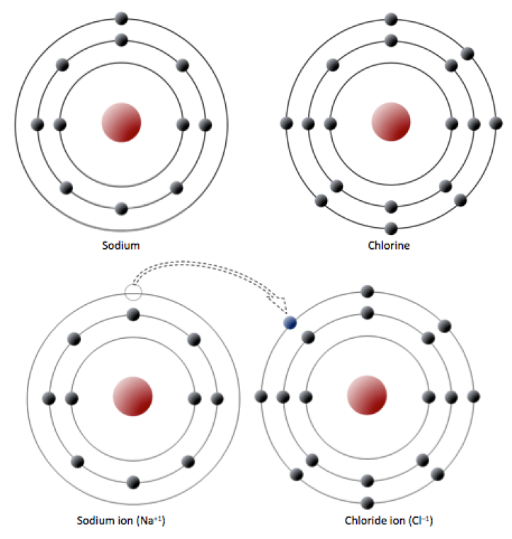 El sodio tiene 11 electrones: dos en la primera capa, ocho en la segunda y uno en la tercera (figura 2.2.1). El sodio cede fácilmente ese único electrón de la tercera capa y, cuando pierde esta carga negativa, se carga positivamente (porque ahora tiene 11 protones y sólo 10 electrones). Al renunciar a su único electrón de la tercera corteza, el sodio acaba teniendo la corteza externa llena. El cloro, por su parte, tiene 17 electrones: dos en la primera capa, ocho en la segunda y siete en la tercera. El cloro acepta fácilmente un octavo electrón para llenar su tercera capa y, por tanto, se carga negativamente porque tiene 17 protones y 18 electrones. Al cambiar su número de electrones, estos átomos se convierten en iones: el sodio pierde un electrón para convertirse en un ion positivo o catión, y el cloro gana un electrón para convertirse en un ion negativo o anión (figura 2.2.1).
