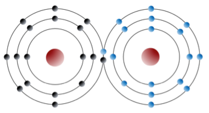 Un elemento como el cloro también puede formar enlaces sin formar iones. Por ejemplo, dos átomos de cloro, que buscan cada uno un octavo electrón en su capa externa, pueden compartir un electrón en lo que se conoce como enlace covalente para formar cloro gas (Cl2) (Figura 2.2.2). Los electrones se comparten en un enlace covalente.