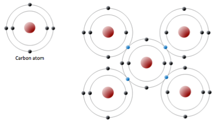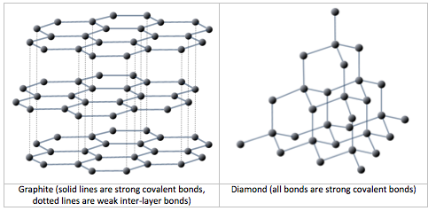 Un átomo de carbono tiene seis protones y seis electrones; dos de los electrones están en la capa interna y cuatro en la externa (Figura 2.2.3). El carbono necesitaría ganar o perder cuatro electrones para tener una capa exterior llena, lo que crearía un desequilibrio de carga demasiado grande para que el ion fuera estable. Por otro lado, el carbono puede compartir electrones para crear enlaces covalentes. En el mineral diamante, los átomos de carbono están unidos en una estructura tridimensional, en la que cada átomo de carbono está unido a otros cuatro átomos de carbono y cada enlace es un enlace covalente muy fuerte. En el mineral grafito, los átomos de carbono están unidos entre sí en láminas o capas (figura 2.2.3), y cada átomo de carbono está unido covalentemente a otros tres. Los compuestos a base de grafito, que son resistentes gracias al fuerte enlace covalente intracapa, se utilizan en equipos deportivos de alta gama, como las bicicletas de carreras ultraligeras. El grafito en sí es blando porque la unión entre estas capas es relativamente débil, y se utiliza en diversas aplicaciones, como lubricantes y lápices.