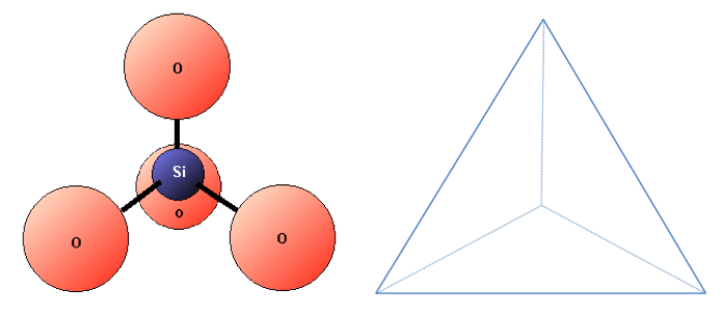El silicio y el oxígeno se unen para crear un tetraedro de sílice, que tiene forma de pirámide de cuatro lados con O en cada esquina y Si en el centro (figura 2.2.4). Esta estructura es el componente básico de los minerales de silicato (que se describen en el apartado 2.4). Los enlaces en un tetraedro de sílice tienen algunas de las propiedades de los enlaces covalentes y algunas de las propiedades de los enlaces iónicos. Como resultado del carácter iónico, el silicio se convierte en un catión (con una carga de +4) y el oxígeno en un anión (con una carga de -2). La carga neta de un tetraedro de sílice (SiO4) es: 4 + 4(-2) = 4 – 8 = -4. Como veremos más adelante, los tetraedros de sílice (plural de tetraedro) se unen de diversas maneras para formar la mayoría de los minerales comunes de la corteza.
