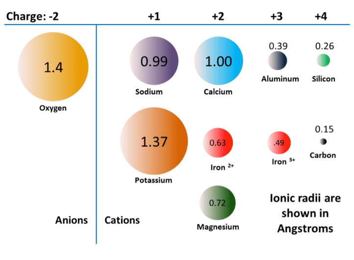 Como ya se ha señalado, los iones de hierro y magnesio son similares en tamaño (aunque no exactamente iguales). Esto les permite sustituirse mutuamente en algunos minerales silicatos. De hecho, los iones comunes en los minerales silicatos presentan una amplia gama de tamaños, tal como se muestra en la Figura 2.4.2. Todos los iones representados son cationes, excepto el oxígeno. Cabe destacar que el hierro puede existir tanto como un ión con carga +2 (si pierde dos electrones durante la ionización) como un ión con carga +3 (si pierde tres electrones). El Fe²⁺ se conoce como hierro ferroso, mientras que el Fe³⁺ se conoce como hierro férrico. Los radios iónicos son críticos para la composición de los minerales silicatos, por lo que volveremos a referirnos a este diagrama más adelante.