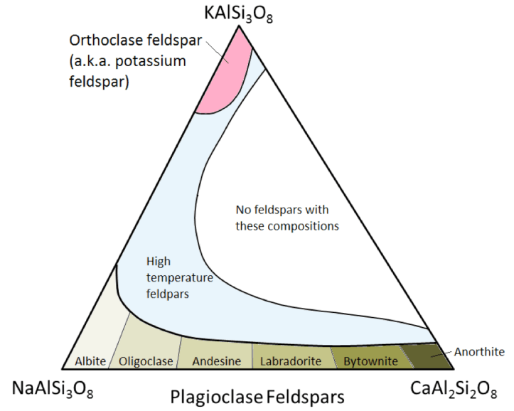 Los tres principales minerales de feldespato son el feldespato potásico (también llamado K-feldespato o K-spar) y dos tipos de feldespato plagioclasa: albita (solo sodio) y anortita (solo calcio). Como sucede con el hierro y el magnesio en el olivino, existe una gama continua de composiciones (serie de solución sólida) entre la albita y la anortita en la plagioclasa. Dado que los iones calcio y sodio son casi idénticos en tamaño (1,00 Å frente a 0,99 Å), pueden existir composiciones intermedias entre CaAl₂Si₃O₈ y NaAlSi₃O₈ (véase la Figura 2.4.6). Esto resulta algo sorprendente porque, aunque son muy similares en tamaño, los iones calcio y sodio no tienen la misma carga (Ca²⁺ frente a Na⁺). Este problema se resuelve mediante la sustitución correspondiente de Al³⁺ por Si⁴⁺. Así, la albita es NaAlSi₃O₈ (1 Al y 3 Si), mientras que la anortita es CaAl₂Si₂O₈ (2 Al y 2 Si), y los feldespatos plagioclasas de composición intermedia presentan proporciones intermedias de Al y Si. Este fenómeno se denomina “sustitución acoplada” (coupled-substitution).