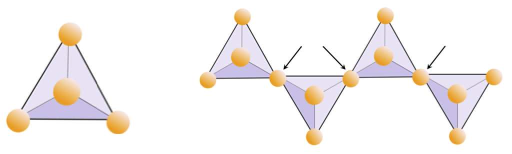 La gran mayoría de los minerales que componen las rocas de la corteza terrestre son minerales silicatos. Entre ellos se incluyen minerales como el cuarzo, el feldespato, la mica, la anfíbola, el piroxeno, la olivina y una variedad de minerales arcillosos. La unidad estructural básica de todos estos minerales es el tetraedro de sílice, una combinación de cuatro átomos de oxígeno y un átomo de silicio. Como hemos visto, se denomina tetraedro porque los planos trazados a través de los átomos de oxígeno forman una figura con cuatro caras (véase la Figura 2.2.4).Dado que el ión silicio tiene una carga de +4 y cada uno de los cuatro iones oxígeno tiene una carga de −2, el tetraedro de sílice posee una carga neta de −4.