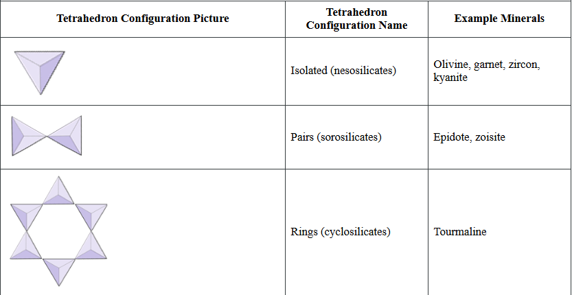 En los minerales silicatos, estos tetraedros se organizan y enlazan de diversas maneras, desde unidades individuales hasta estructuras complejas en armazón (véase la Tabla 2.6).La estructura de silicato más simple, correspondiente al mineral olivino, está compuesta por tetraedros aislados unidos a iones de hierro y/o magnesio. En el olivino, la carga de −4 de cada tetraedro de sílice se compensa con dos cationes divalentes (es decir, con carga +2) de hierro o magnesio. El olivino puede tener la composición Mg₂SiO₄ o Fe₂SiO₄, o bien una combinación de ambas, expresada como (Mg,Fe)₂SiO₄. Los cationes divalentes de magnesio e hierro son muy similares en radio iónico (0,73 frente a 0,62 Å [angstroms]). Debido a esta similitud de tamaño, y a que ambos son cationes divalentes (ambos pueden tener carga +2), el hierro y el magnesio pueden sustituirse fácilmente entre sí en el olivino y en muchos otros minerales.